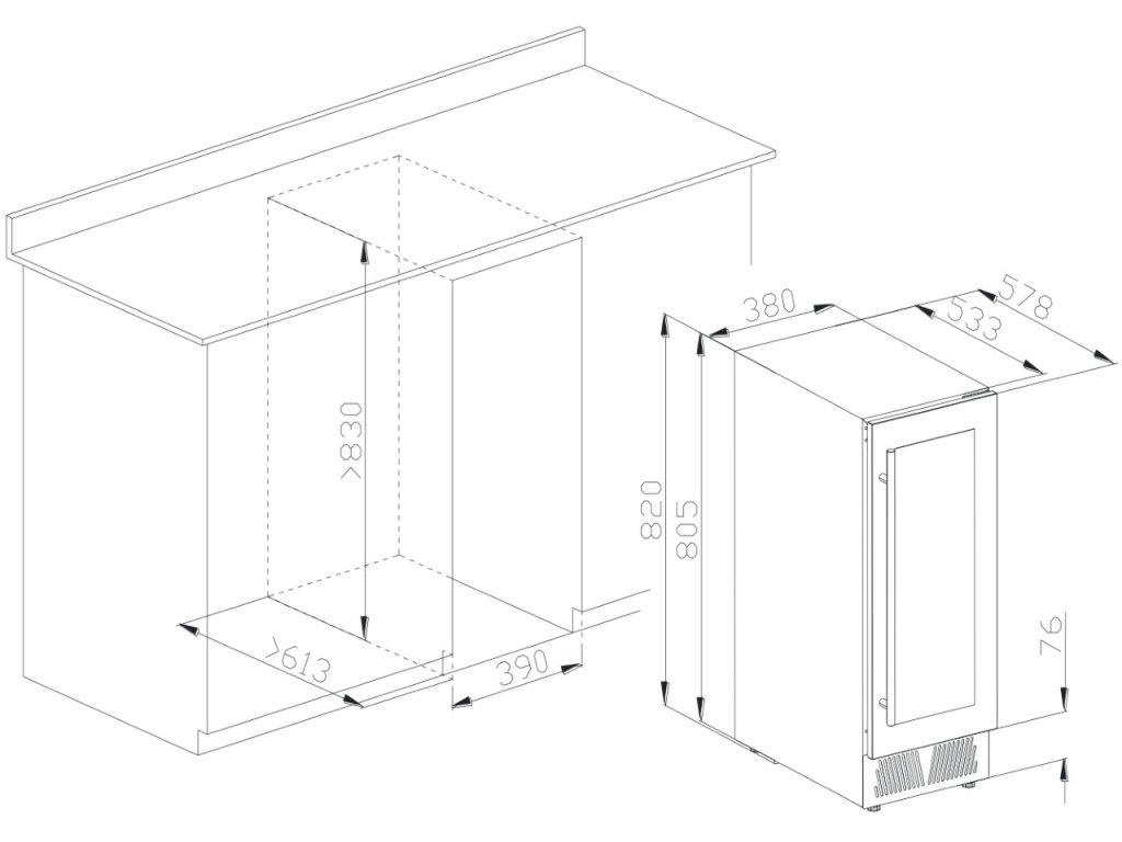 - Nastavitelné nožičky pro vyrovnání i na nerovném povrchu (výška vinotéky bez nožiček je 805 mm, výška v rozmezí stavitelných nožiček je 820-865 mm)