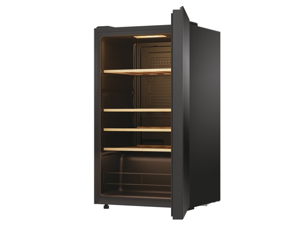 Čtyři dřevěné police poskytují bezpečné a přehledné uložení lahví. Vnitřní LED osvětlení zajišťuje luxusní vzhled i praktický přehled o uložených vínech.