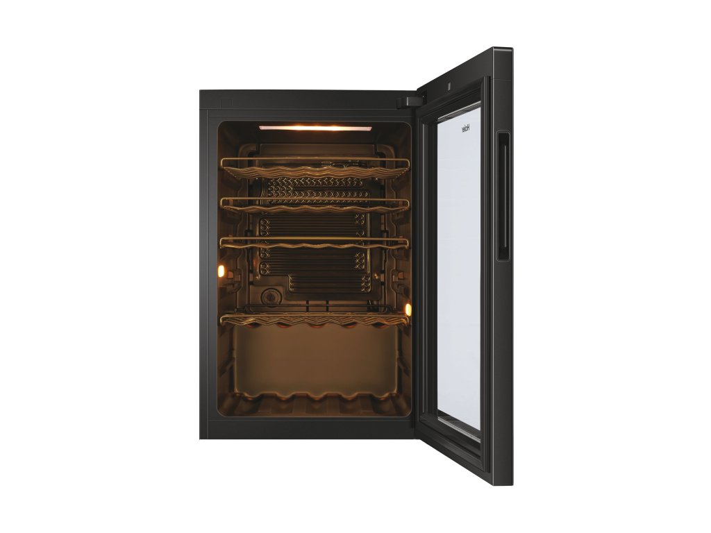 Uvnitř se nachází 4 kovové police, které umožňují přehledné uspořádání lahví. LED osvětlení elegantně nasvítí interiér vinotéky bez zahřívání.