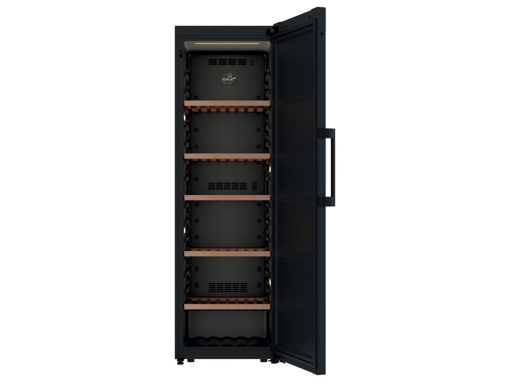 Uvnitř najdete 5 dřevěných polic, které poskytují pevné a stabilní uložení lahví a podporují správnou cirkulaci vzduchu kolem nich.