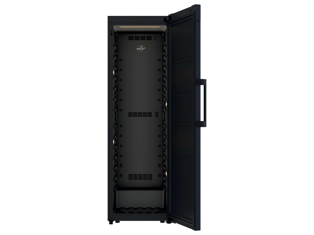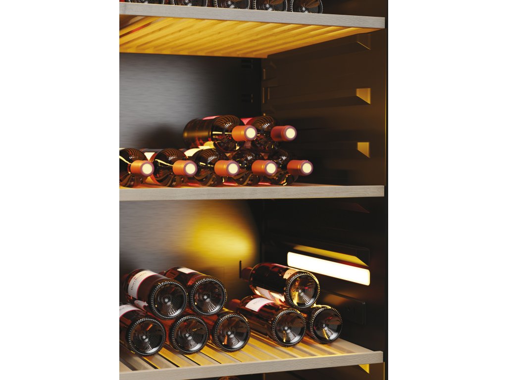 LED osvětlení interiér jemně nasvítí bez nadměrného tepla. Dvířka jsou z temperovaného skla s UV filtrem, který chrání víno před poškozením světlem.