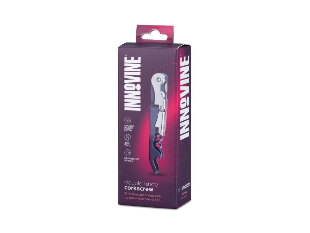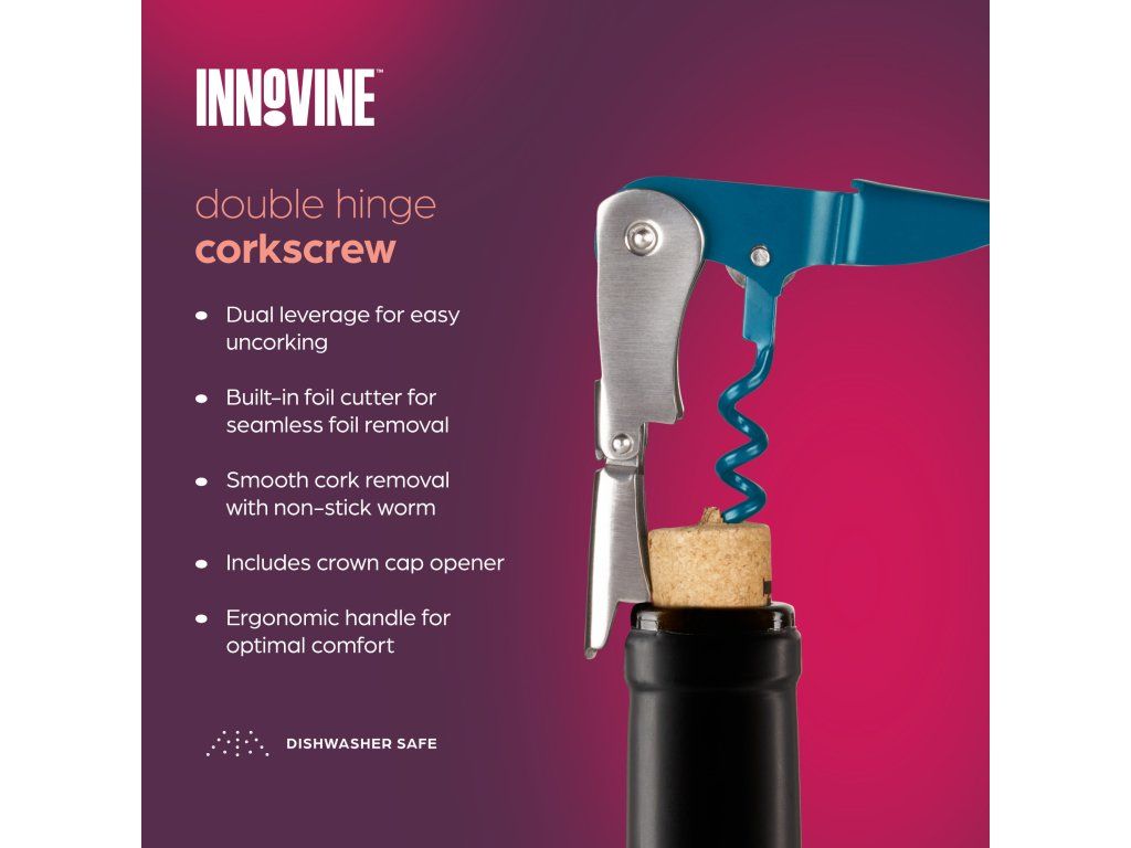 Vývrtka s dvojitým pantem Innovine v modrém provedení je navržena pro pohodlné otevírání lahví vína. Díky dvojitému pantu umožňuje plynulejší práci s korkem a zajišťuje větší kontrolu při otevírání.